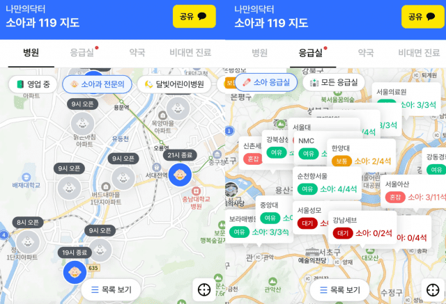 현재 공휴일 의료기관 정보를 제공하는 서비스는 보건복지부의 응급의료포털(E-GEN), 국립중앙의료원의 ‘내 손안의 응급실’ 등이 있다. 하지만 전체 의료기관 정보를 제공하고 있어서 소아과를 찾는 부모들은 사용에 애를 먹곤 한다.