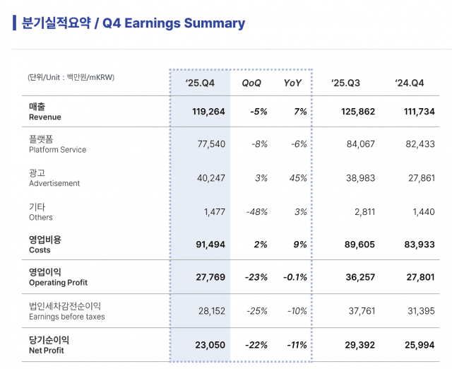 연간 성장은 광고 부문의 실적 상승이 견인했다. 지난해 연간 광고 매출은 1319억원으로 전년 대비 61.4% 증가했다. 자체 제작 역량을 바탕으로 한 콘텐츠형 광고가 41.1% 성장했고, 지난해 2분기부터 자회사 플레이디의 실적이 더해지며 전체적인 광고 매출 확대로 이어졌다.