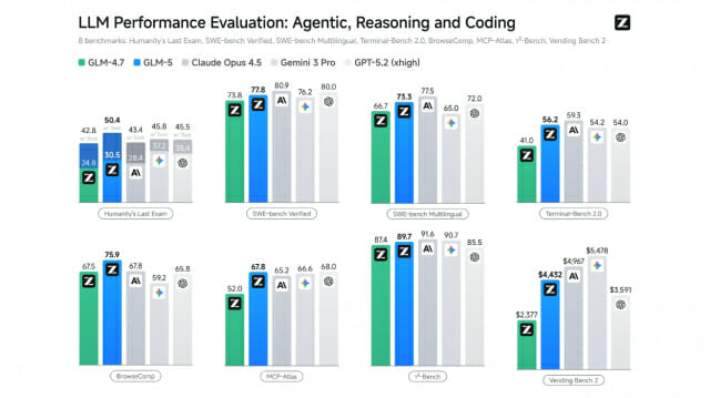 GLM-5는 다양한 벤치마크 테스트에서 오픈소스 AI 모델 중 최고 수준의 성능을 기록했다. 추론, 코딩, 에이전트 작업에서 특히 강점을 보였으며, 클로드 오푸스(Claude Opus) 4.5나 GPT-5.2 같은 비공개 최첨단 모델과의 격차도 좁혔다.