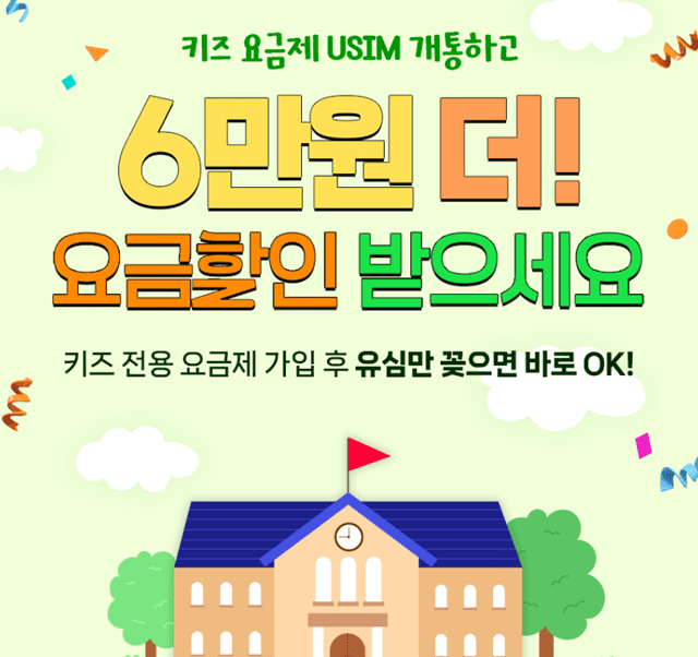 KT닷컴에서 ‘Y주니어 19.8’, ‘Y주니어 ON’, ‘5G 주니어’, ‘5G 주니어 슬림’ 등 주니어 요금제 4종 USIM 단독 가입자에게 매월 1만원 씩 6개월, 총 6만원을 할인해준다. 키즈 요금제 전용 실시간 위치·이동경로 제공, 핸드폰 사용량 관리, 유해사이트 차단 기능 등 KT 안심박스도 무료로 제공한다.
