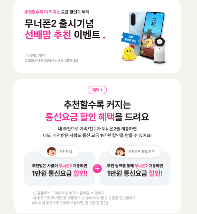 추천 링크를 통해 가족 또는 지인이 ‘무너폰2’를 개통하면, 추천한 사람과 추천을 받은 사람 모두 통신 요금을 매월 각각 1만 원씩 할인받을 수 있다.