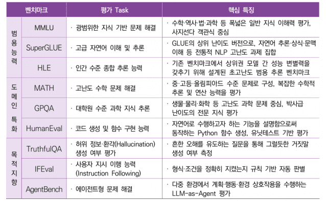 보고서에 따르면 벤치마크 데이터셋은 표준화된 문제와 평가 기준을 통해 동일한 조건에서 여러 AI 모델의 성능을 비교·검증하는 테스트베드 역할을 한다. 이미 구글, 오픈AI 등 글로벌 빅테크 기업들은 범용 지식(MMLU), 수학(MATH), 진실성(TruthfulQA) 등 다양한 벤치마크 지표를 통해 자사 모델의 우수성을 입증하고 있다.