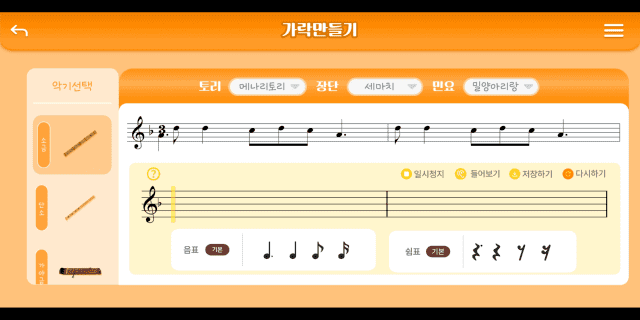 국악놀이터의 핵심 콘텐츠 중 하나인 '가락만들기'는 이용자에게 작곡의 재미를 선사한다. 소금, 단소, 가야금, 해금, 양금, 대금, 거문고, 피리 등 총 8종의 악기를 선택할 수 있으며, 각 지역의 음악적 특징인 토리와 장단을 고르면 그에 맞는 악보가 제공된다.