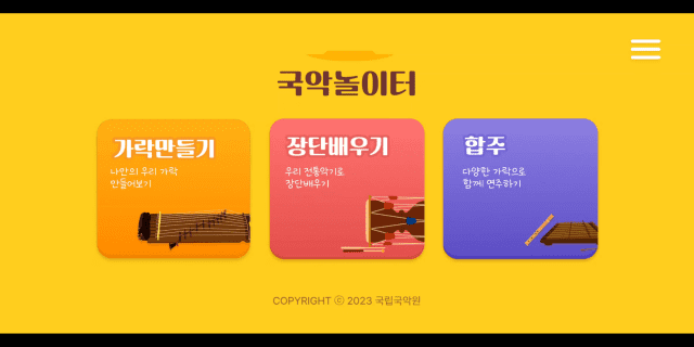가락만들기 및 장단배우기에서 제작한 악보를 최대 4개까지 모아 재생하는 '악보모드'와, 타악기 4종을 실시간으로 연주하는 '자유모드'가 있어 온 가족이 함께 작은 국악단을 꾸리기에는 제격이다.