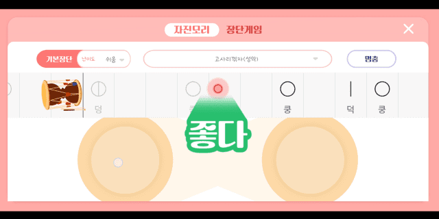 국악의 기초인 장단을 익히는 과정은 마치 리듬 게임처럼 구성돼 재미를 더했다. '장단배우기'에서는 장구, 꽹과리, 징, 북 등 4가지 타악기를 다룰 수 있다. 아울러 자진모리, 중중모리, 굿거리, 세마치 등 기초 장단부터 비교적 연주 난도가 높은 변형 장단까지 폭넓게 제공한다.