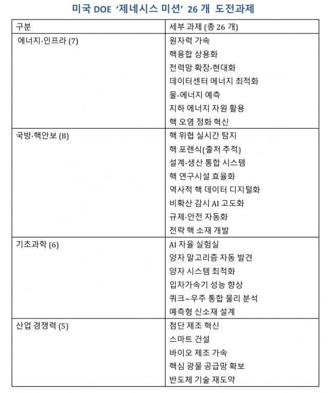 미국이 내세운 26개 도전 과제 핵심은 과학 발견 속도의 비약적 향상과 에너지 시스템 신뢰성·효율성 강화, 국가 안보 역량 확충, 미국 기술·경제 경쟁력 확보다.