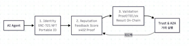 - 식별(Identity): AI에이전트가 온체인에 "나는 누구인가?"를 증명하는 디지털여권(ERC-721 NFT+JSON 메타데이터)