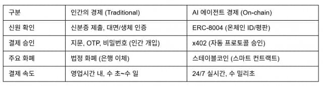 AI 에이전트는 기존 금융 시스템을 이용할 수 없습니다. 전통 금융은 오직 '생물학적 인간'만을 위해 설계됐기 때문입니다. 신원인증(KYC)을 위해 신분증과 얼굴 대조를 요구하고, 결제 마지막 순간에는 일회용 비밀번호(OTP)나 지문인식 같은 인간의 개입을 강제합니다.