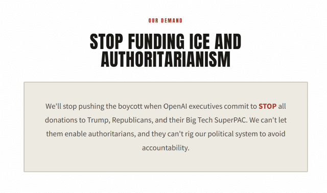 19일 IT 업계에 따르면 오픈AI 경영진이 도널드 트럼프 미국 대통령을 지지하는 '슈퍼팩(SuperPAC)'에 거액을 후원한 사실과 이민세관단속국(ICE)이 챗GPT를 사용하고 있다는 소식 후 큇GPT 운동이 미국에서 확산한 것으로 전해졌다.