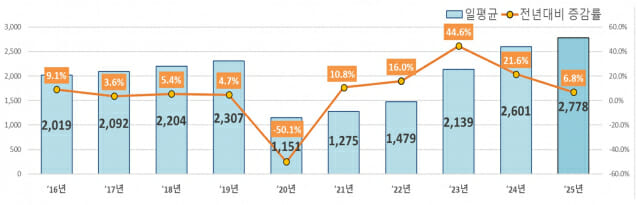 이는 하루 평균 2778대의 항공기가 우리나라 하늘을 오간 것으로, 코로나19 이전 최고치였던 2019년 84만여 대를 20% 가량 웃도는 역대 최대 수준이다.