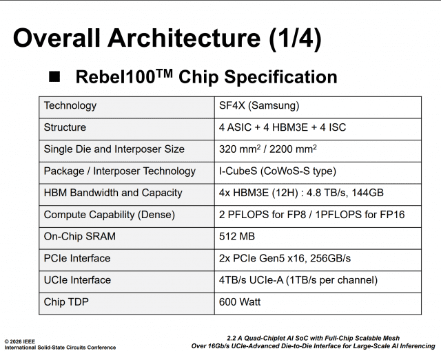 세계 최고 권위 반도체 설계 학회인 ISSCC(국제고체회로학회) 최신 발표 자료에 따르면 리벨 쿼드의 FP16 연산 성능은 1 PFLOPS로 H200(0.99 PFLOPS)과 비슷하며, 메모리 용량 또한 144GB로 H200(141GB)보다 소폭 높다. 이는 세계 최초로 UCIe-Advanced 다이-투-다이(Die-to-Die) 인터페이스를 적용해 4개의 칩렛을 하나의 칩처럼 구동시킨 결과다.