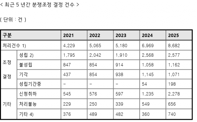 19일 국회 정무위원회 소속 김남근 더불어민주당 의원이 한국소비자원에서 제출받은 자료에 따르면 지난 2021년부터 2025년까지 분쟁조정 처리 건수는 2021년 4229건에서 2025년 8682건으로 증가했다. 같은 기간 조정 결과 ‘불성립’은 847건에서 1162건으로 늘었다.