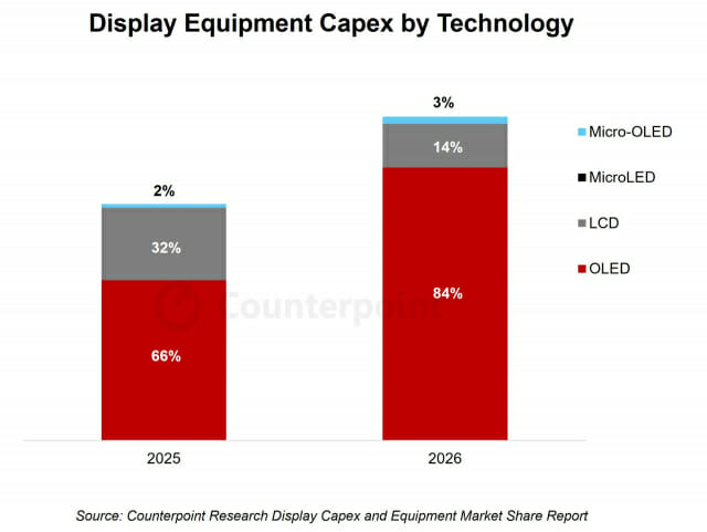 또한 카운터포인트리서치는 2028~2030년까지의 전체 디스플레이 투자 전망을 확대했다. 2023년부터 2030년까지 전체 투자 규모 중 67%는 OLED, 30%는 LCD, 마이크로 OLED는 2%의 비중을 차지할 것으로 예상된다.
