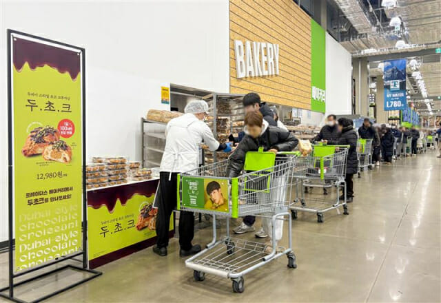 지난달 말 출시한 ‘두초크(두바이 스타일 초코 크루아상)’도 두바이쫀득쿠키 열풍에 올라탔다. 이마트와 트레이더스 일부 매장에서는 오픈런이 이어지면서 판매 물량과 매장을 확대했다.