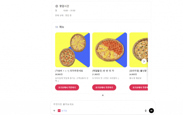 요기요는 대화형 추천에 그치지 않고, 요기요 화면을 위젯 형태로 표시해 탐색 단계를 줄이겠다는 구상이다. 예컨대 특정 지역·메뉴를 말하면 매장 후보와 대표 메뉴가 노출되고, 매장을 지정하면 해당 매장의 메뉴와 정보가 바로 나오는 방식이다.