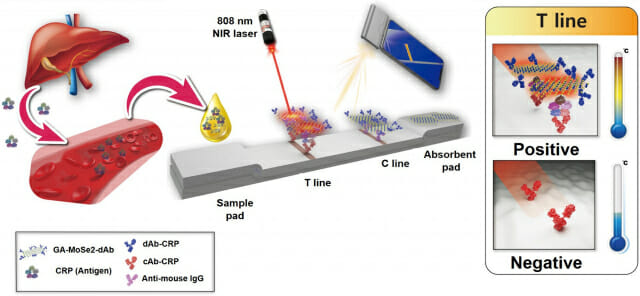 연구팀에 따르면 'GA–MoSe2 나노시트'는 근적외선(808nm) 조사 시 매우 우수한 광열 변환 효율(64.6%)과 장기 안정성을 나타내는 점에 주목했다. 기존 신속 키트에 사용되던 금 나노입자 대신 이 나노시트를 진단 검출소재로 활용, 정량적이고 민감한 온도 기반 신호 검츨이 가능하다는 것을 확인했다.