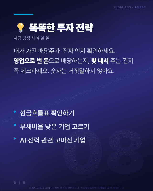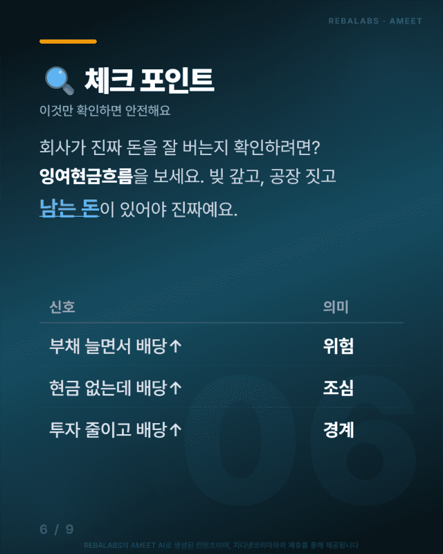 핵심은 배당 수익률이 아니라 배당의 원천을 보는 거예요. 회사가 영업 활동으로 꾸준히 돈을 벌고 있는지, 빚은 적고 현금은 충분한지, 미래 투자 여력이 있는지를 꼼꼼히 따져봐야 해요. 특히 '잉여현금흐름'이란 지표를 확인해보세요. 이건 빚 갚고, 설비 투자하고 나서도 남는 진짜 여유 자금을 뜻하는데요, 이 숫자가 튼튼해야 앞으로도 배당을 꾸준히 받을 수 있어요.