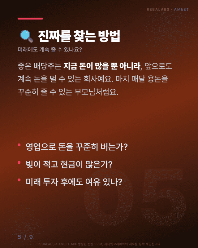 단순히 배당 퍼센트만 보고 투자했다간 나중에 배당이 뚝 끊기거나 주가가 곤두박질칠 수도 있거든요. 숫자는 거짓말하지 않으니까, 지금 내 계좌에 있는 배당주들이 진짜인지 한 번쯤 점검해보는 건 어떨까요? 진짜 배당주만이 여러분의 소중한 자산을 지켜줄 수 있답니다!