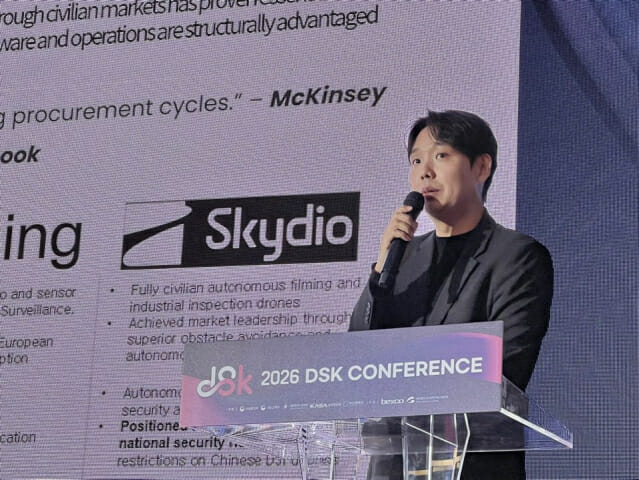 김영준 파블로항공 의장 겸 창업자는 25일 부산 벡스코에서 열린 '2026 DSK 컨퍼런스'에서 드론 산업이 민수에서 방산 중심으로 재편되고 있다고 진단했다. 글로벌 분쟁 확산과 국방비 증가, 저비용 고효율 전장으로 산업 구조가 바뀌고 있다는 분석이다.