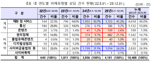 지난해 상담건수는 '재화 및 서비스' 관련 피해상담이 1723건(41.2%)으로 가장 많았고, 뒤이어 '사이버금융범죄 등' 1014건(24.2%), '권리침해' 882건(21.1%), '통신' 386건(9.2%), '콘텐츠' 109건(2.6%), '불법유해콘텐츠' 40건(1.0%), '디지털성범죄' 26건(0.6%) 등의 순으로 나타났다.