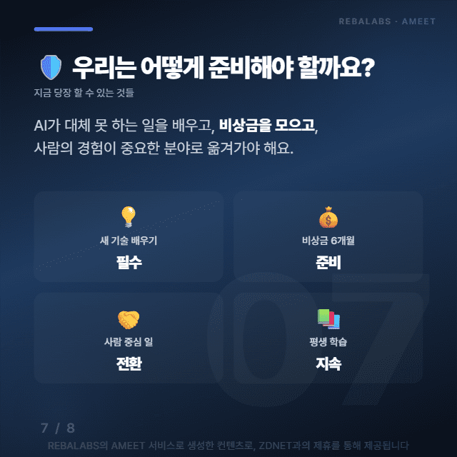 그럼 우리는 어떻게 준비해야 할까요? 전문가들은 세 가지를 권하고 있어요. 첫째, AI가 못 하는 손기술이나 마음 쓰는 일을 배우는 거예요. 둘째, 6개월치 비상금을 모아두는 것도 중요하고요. 셋째, 만약 부모님이 컴퓨터 일만 하신다면 다른 기술도 함께 배우시도록 도와드리는 게 좋아요. 폭풍이 올 때 가장 위험한 건 폭풍 자체가 아니라, 내일도 오늘처럼 계속될 거라고 믿는 거라는 말이 있잖아요.