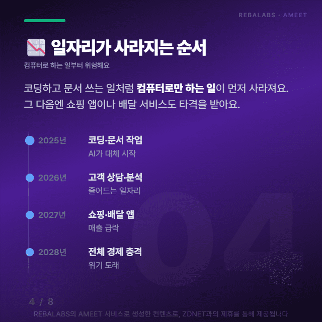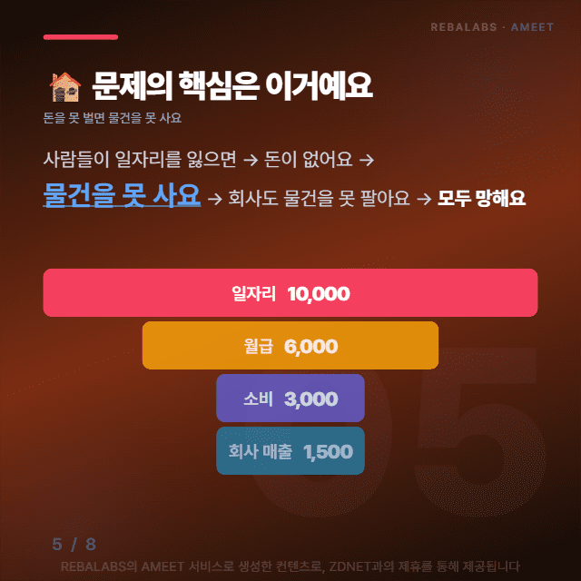 마치 빵집이 빵을 산더미처럼 만들었는데 동네 사람들 주머니가 텅텅 비어서 아무도 못 사는 것과 똑같은 상황이죠. 더 걱정되는 건 이게 도미노처럼 연쇄적으로 무너진다는 거예요. AI가 일을 대신하면 사람들이 직장을 잃고, 물건을 못 사니까 회사들도 연쇄 부도가 나는 악순환이 시작되는 거죠.