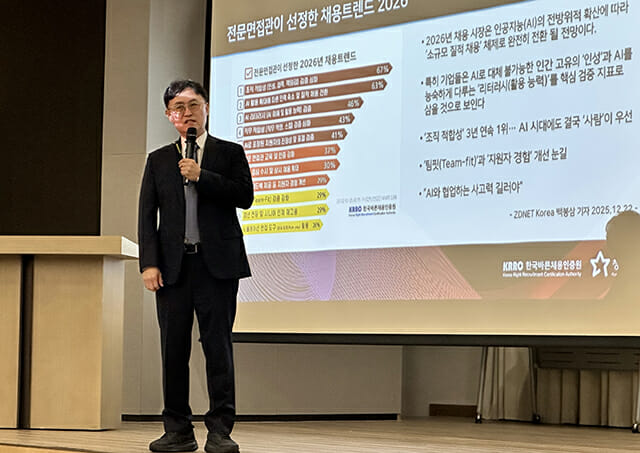 발표자로 나선 윤영돈 커리어코치협회 부회장은 2026년 채용 트렌드를 ▲팀핏 중심 채용 ▲스킬 기반 채용 ▲커리어 오너십 강화의 세 가지로 정리했다.