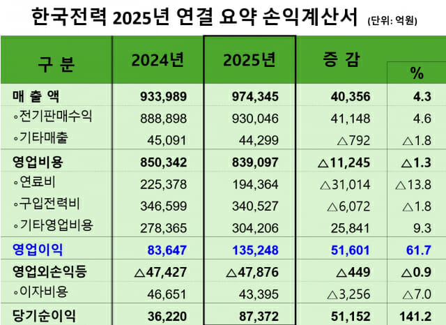 한국전력(대표 김동철은 2025년 결산 결과, 매출액은 전년대비 4.3% 증가한 97조4345억원, 영업비용은 1.3% 감소한 83조9097억원을 기록했다고 26일 밝혔다. 영업이익은 전년보다 5조1601억원 증가한 13조5248억원으로 집계됐다.