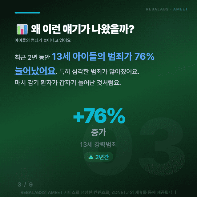 지금은 13세 아이가 나쁜 일을 해도 감옥에 가지 않거든요. 그런데 왜 이런 얘기가 나왔냐면, 최근 2년 동안 13세 아이들의 범죄가 무려 76%나 늘어났기 때문이에요. 특히 심각한 범죄 비율이 높아졌고요. 그래서 "이제는 13세도 어른처럼 처벌해야 하는 거 아니냐"는 목소리가 나오고 있어요.