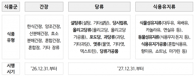 간장은 오는 12월 31일부터 시행된다. 당류와 식용유지류는 내년 12월 31일부터 실시된다.