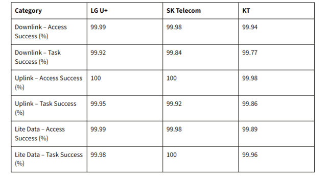 안전한 데이터 경로를 설정하고 중단 없이 데이터 전송을 완료할 수 있는지 측정하는 데이터 안정성 부문에서 LG유플러스는 다운링크, 업링크 작업 완료율에서 각각 0.08%와 0.05%의 실패율을 기록하며 타사 대비 우수한 성능을 보였다.