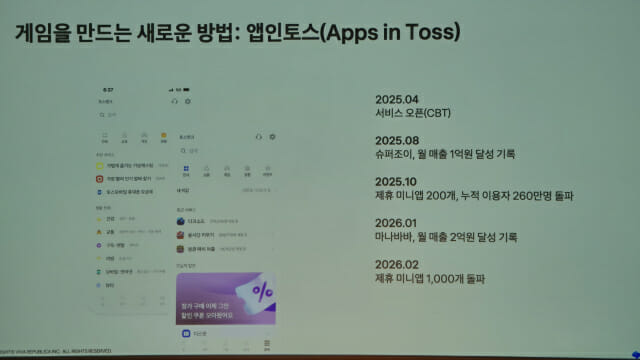 황 본부장은 앱인토스 성장 배경으로 토스 플랫폼의 강력한 이용자 접점 활용과 혁신적인 사용자 경험을 꼽았다. 그는 "토스 내 푸시 알림이나 광고 등 다양한 지면을 통해 사용자 노출 접점을 극대화했다"며 "앱 다운로드와 회원가입 등 번거로운 절차 없이 플레이 가능한 경험을 한 것이 성공의 핵심 원동력"이라고 분석했다.