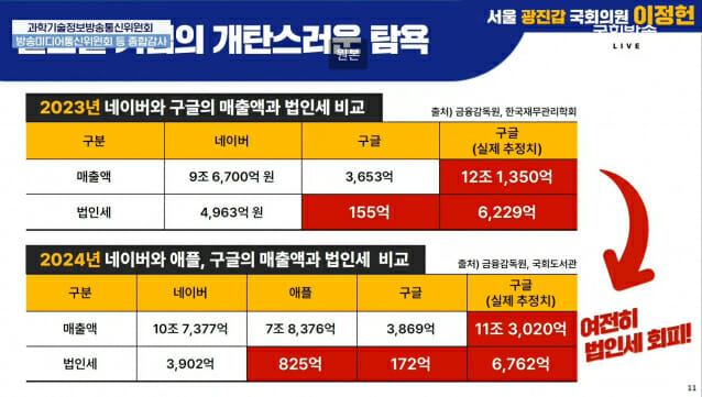 구글은 국내에서 10조원이 넘는 매출을 거두고 있는 것으로 추정되지만 고정 사업장이 없다는 이유로 대부분의 매출을 싱가포르로 이전시키는 방식을 통해 100억원대의 법인세만을 납부하고 있다. 이는 비슷한 규모의 매출을 기록한 네이버가 2024년 낸 법인세 3902억원의 4% 수준에 불과하다.