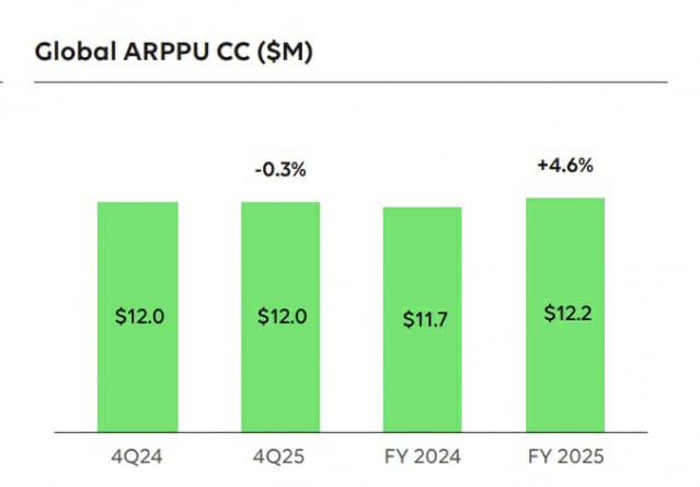 한국은 이용자 수가 감소했지만 수익성 지표는 개선됐다. 연간 월간활성이용자(MAU)는 2천400만명으로 전년 대비 11.1% 줄었고, 유료 이용자(MTU)는 360만명으로 5.3% 감소했다. 반면 유료 전환율은 14.8%로 0.91%포인트 상승했고, 이용자당 평균매출(ARPU)은 고정환율 기준 4.7% 증가한 8.2달러를 기록했다.