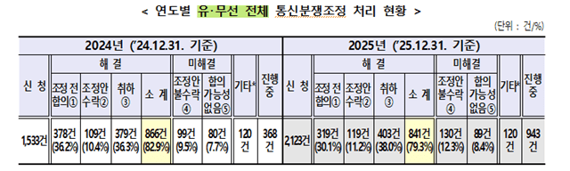 지난해 전체 통신분쟁조정 해결률은 전년 대비 3.6%p 하락한 79.3%로 나타났다.