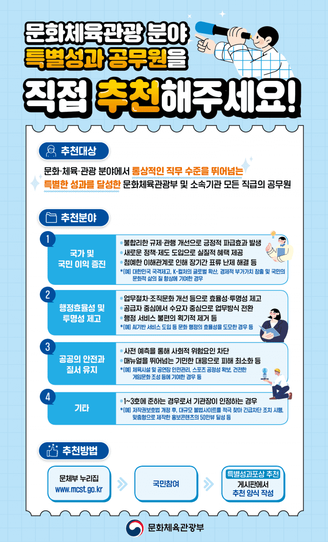 문체부는 이번 특별성과 포상을 시작으로 적극행정을 장려하는 조직 문화를 확산할 계획이다. 이달부터는 문체부 누리집에 ‘특별성과 포상 추천’ 코너를 마련해 국민이 직접 성과 공무원을 추천할 수 있도록 할 예정이다.