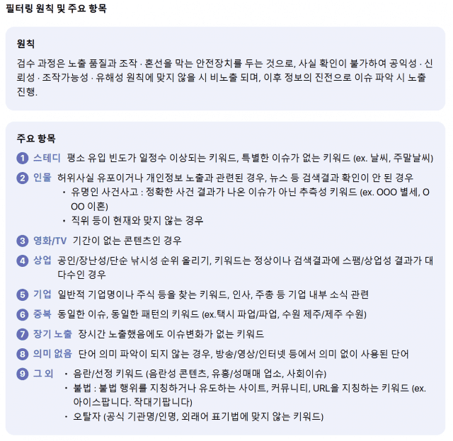 먼저 회사는 선거개입 가능성을 원천 차단했다고 강조했다. 다음은 선거일 60일 전부터(지방자치단체장의 선거에 영향을 미치는 행위금지 기간) 후보자와 관련 인물 키워드를 제외하는 원칙을 적용한다. 또 허위사실이나 추측성 사건사고 키워드, 음란·불법 키워드 등은 자동 필터링과 운영자 검수를 통해 노출되지 않도록 했다.