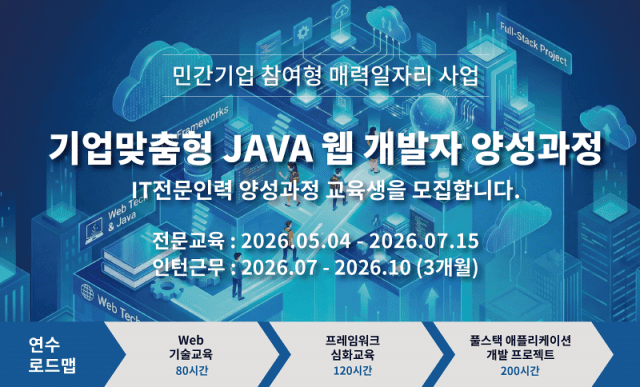 교육은 '기업 맞춤형 자바 웹 개발자 양성과정'으로 오는 5월 4일부터 10주 과정으로 진행된다. ▲리액트 기반 프론트엔드 ▲자바·데이터베이스 SQL 활용 ▲생성형 AI API 연동 및 풀스택 애플리케이션 개발 등 실습 위주의 교육을 진행한다. 교육 종료 후에는 채용 협약 기업과 매칭해 3개월간 인턴십을 진행하고 정규직 채용을 연계한다.