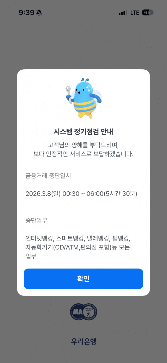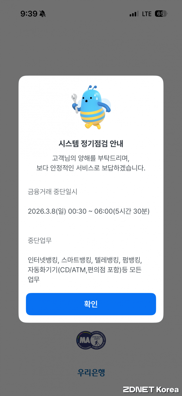 우리은행은 지난 6일 우리은행 모바일 뱅킹 등을 통해 8일 0시 30분부터 새벽 6시까지 5시간 30분동안 시스템 정기점검으로 모든 거래가 일시 정지된다고 밝혔다.