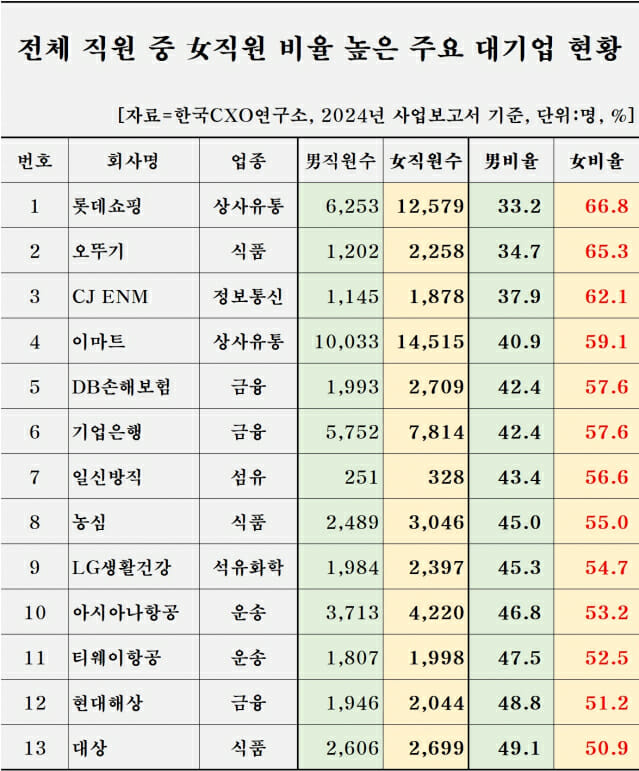 개별 기업 가운데 여성 비중이 가장 높은 곳은 롯데쇼핑이었다. 롯데쇼핑은 전체 직원 1만8832명 중 여성 직원이 1만2579명으로 66.8%를 차지했다. 오뚜기는 3460명 중 여성 비중이 65.3%(2258명)로 2위였고, CJ ENM도 62.1%로 60%를 넘었다. 이마트(59.1%), 기업은행·DB손해보험(각 57.6%), 일신방직(56.6%), 농심(55.0%), LG생활건강(54.7%), 아시아나항공(53.2%), 티웨이항공(52.5%), 현대해상(51.2%), 대상(50.9%)도 여성 비중이 절반을 웃돌았다.