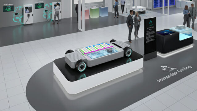 SK온은 차량 하부 모형에 액침냉각 팩을 적용하고, 액침냉각 소형 모듈이 냉각 플루이드에 침지된 모습 등을 연출했다.