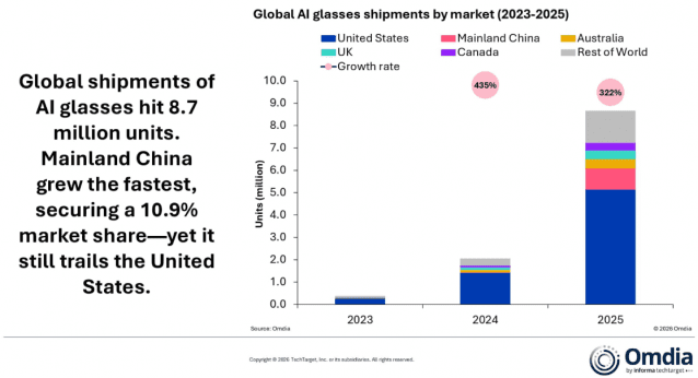 전세계 인공지능(AI) 글래스 출하량이 지난해 870만대에서 올해 1500만대 이상으로 상승할 것이라고 시장조사업체 옴디아가 최근 전망했다.