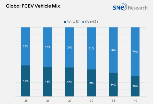 차종별로 보면 FCEV 시장은 승용차 중심에서 상용차 중심 구조로 빠르게 전환될 것으로 예상된다.