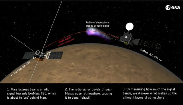연구진은 이번 태양 폭풍의 영향을 조사하기 위해 ‘라디오 엄폐(radio occultation)’라는 기술을 활용했다. 이 기술은 마스 익스프레스가 화성의 지평선 아래로 내려갈 때 TGO로 전파 신호를 보내고, 이 신호가 화성 대기의 여러 층을 통과하며 굴절된 뒤 다시 탐사선으로 돌아오는 과정을 분석하는 방식이다. 이를 통해 연구진은 화성 대기층의 세부 구조를 파악할 수 있었다.