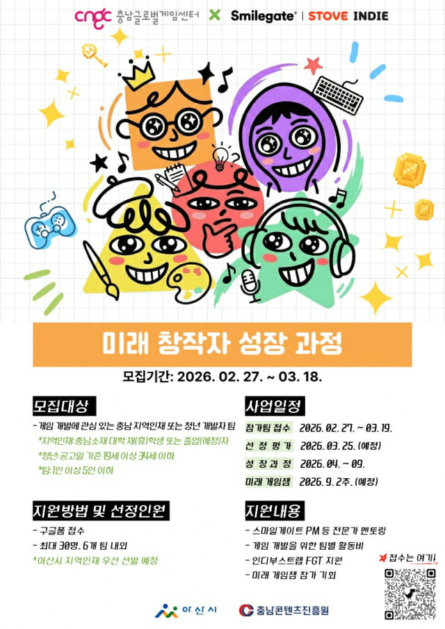 신청 자격은 충청남도에 주소지를 둔 청년이거나 도내 대학교 재학생이라면 누구나 주어지며, 관내에 게임 관련 학과가 많은 아산시 소재 대학 재학생을 우선하여 선발한다. 참여를 희망하는 창작자는 오는 18일까지 온라인을 통해 지원서를 제출하면 되며, 이후 서류 검토와 발표 평가를 거쳐 최종 합격자가 가려진다.