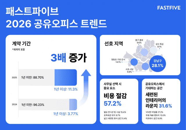 오피스 플랫폼 패스트파이브(대표 김대일)가 2025년 오피스 이용 데이터를 분석한 ‘2026 공유오피스 트렌드’를 10일 발표했다.