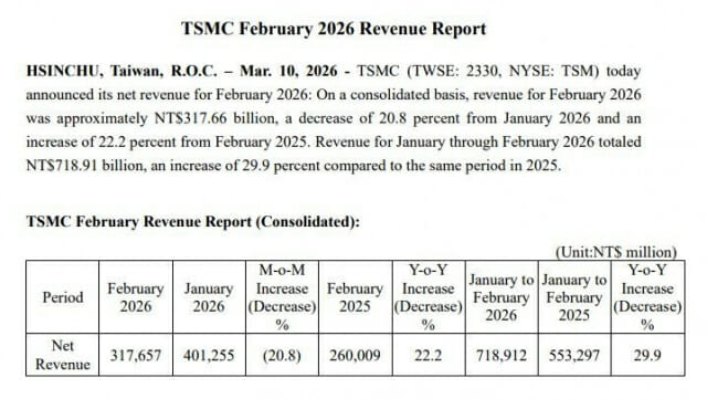 TSMC는 10일(현지시간) 2026년 2월 매출이 3천176억5천700만 대만달러(약 14조 7천202억원)를 기록했다고 발표했다. 이는 전년 동기 대비 22.2% 증가한 수치다.