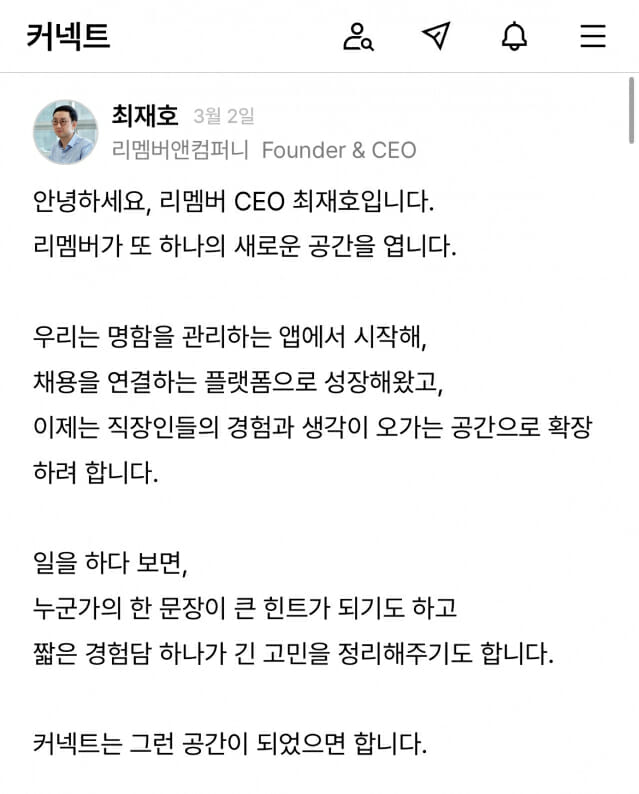 최재호 리멤버앤컴퍼니 각자대표는 커넥트에 "일을 하다보면 누군가의 한 문장이 큰 힌트가 되기도 하고, 짧은 경험담 하나가 긴 고민을 정리해주기도 한다"며 "커넥트가 그런 공간이 됐으면 한다"고 말했다.