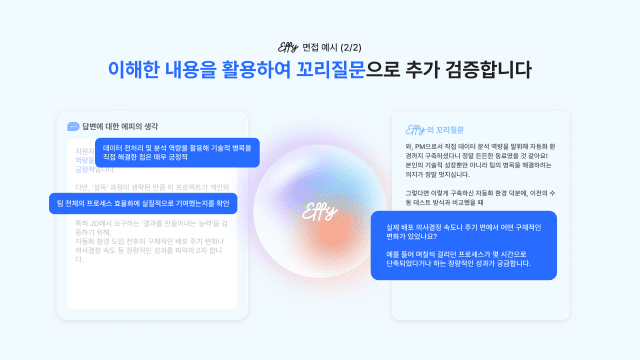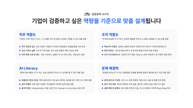 기존 AI 면접이 답변 분석과 점수화 중심이었다면, 에피는 질문 설계와 검증 구조 자체를 체계화하는 데 초점을 둔다. 단순 자동 평가가 아니라 HR이 판단할 수 있는 근거를 구조화해 제공하는 것이 목적이다.