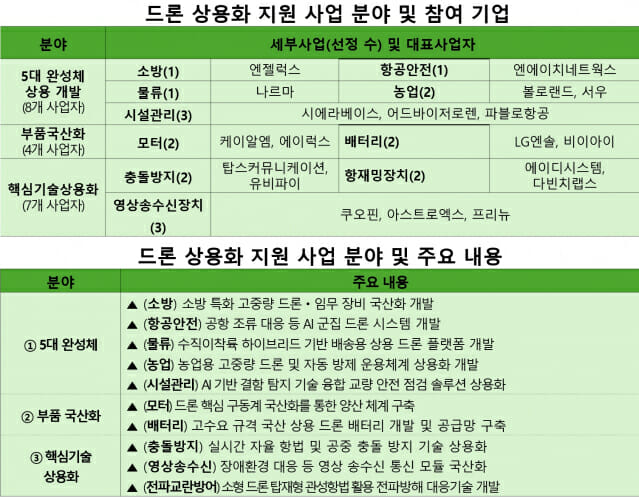 드론 상용화 지원 사업은 국내 활용도가 높은 5대 분야 드론 완성체 개발, 드론 산업 경제안보를 위한 부품(모터·배터리) 국산화, 해외시장 경쟁력 강화를 위한 핵심기술 상용화를 지원한다. 총 19개 기업이 참여한다.